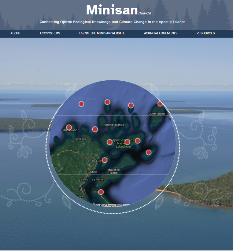 Minisan…Connecting Ojibwe Ecological Knowledge and Climate Change. The Minisan website offers a virtual exploration how climate change is affecting twelve ecosystems within Wenaboozhoo Minisaning (Lake Superior’s Apostle Islands). Indigenous knowledge of the Lake Superior Ojibwe people challenge perspectives on climate change and adaptation with academic climate science providing cross culture knowledge. The website design and resources reflect Ojibwe culture and language.